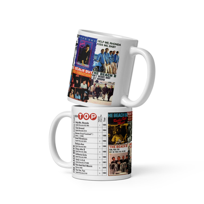 Beach Boys Top 10 best selling USA Singles Ceramic Printed Mug is perfect for any event of the day. Your morning coffee, a hot chocolate, or any other hot beverage you enjoy. The mug is ceramic and glossy white, the prints come out beautiful and vivid on the surface. The print retains its quality and lustre when used in both microwaves and the dishwasher.